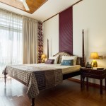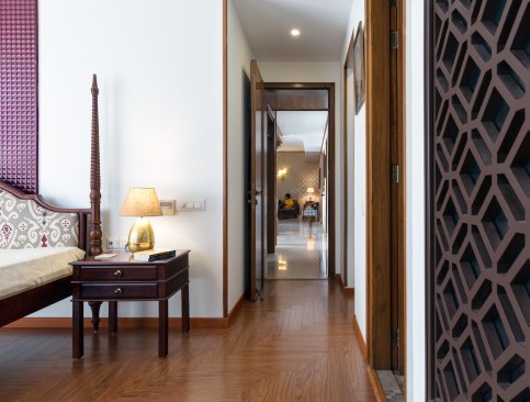 Where the living rooms were earthen and neutral, the bedrooms of Anubhuti are an explosion of colour. Within the master bedroom, the décor has been chosen to include a multitude of patterns and textures. Elegant brass bedside lights flank the bed, with a back-wall done in a hue of red oak, creating a sense of relaxation and homeliness. Wood is used liberally throughout the space with the furniture and accessories having a distinctly Indian character. The master bedroom is flush with natural light with glazing across two walls, with the space itself facing south east, which subsequently reduces the need for extensive lighting systems to be augmented within the space. The guest bedroom is full of warm hues in its décor and furniture. With a warm Nalukettu-inspired wooden frame going around the bedside, and with brass lighting and accessories flanking the bedside, the layout of the space is clean, open and inviting, connecting the bedroom to the rest of the house through a coherent design language.