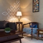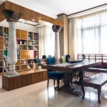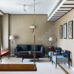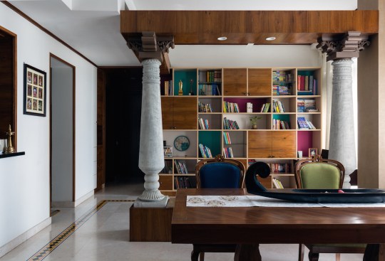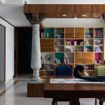 Two distinct spatial axes intersect to create a seamless living area which is split into the living room, the dining room and the spill-out zone, distinguished by their material palette, and distinct illumination characteristics, yet connected with coherence. The choice of furniture for the dining is modern yet laid out eccentrically, with dining chairs and sofa with a trellis back, inspired by Nalukettu style of architecture native to Kerala. This space is topped off with an informal spill-out zone flanked by Chettinad Pillars, which functions as a small study space. While traditional Chettinad pillars are done in Teak, the logistical demands were too great to have them created and then transported from the South. Hence a decision was taken to create them with MDF in a concrete finish. This subsequently led to a visual break from the usage of wood through the space, while also creating a point of intrigue for the viewers.