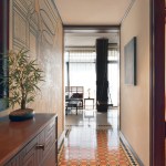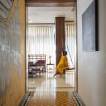 The house, spread across 2600 sq. ft., is a south-facing property and hence, is varnished optimally to let in natural light, with glazing running across an entire side of the house. Designed to create a warm, modern and chic abode for a nuclear family, the house is varnished optimally to let in natural light, while the design palette is inspired by soft earthen and neutral hues. Designed in an Indian Bohemian style, this residence has an ambience that accepts an individual as it is. Opening into a hallway with the living room, the viewer is greeted by an explosion of ochre, with bright Athangudi tiles native to Tamil Nadu greeting the individual to the essence of the south Indian heritage. The hallway is left uncluttered, with a shoe-rack being the only piece of furniture adorning this space. Before the entrance opening into the living room, a mural of an ancient Tamil scripture “Kandar Anubhuti” about Lord Kartikeya adds to the celebration of this family’s heritage.
