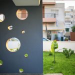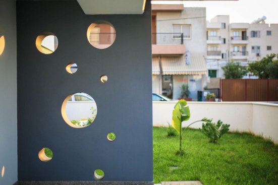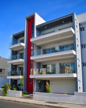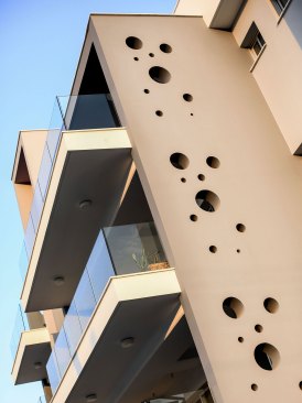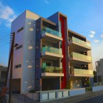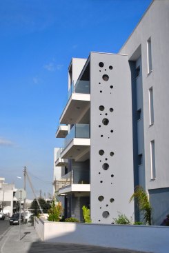 The building is located in Limassol and consisted of 6 apartments. Morphologically , the building is a composition of solid volumes and surfaces, which vary in color and reflect functional differentiations and movements ∙ always aiming to the functionality and the comfort of the user. Dominant feature is the central vertical volume which is marked with a bright red color and serves the vertical movements. The balconies project into “alignment” as a reference to the morphological repeatability of the classic flats – only here, the order and the simplicity are the philosophy of composition. The glass railings highlight the overhanging levels and balance the “heavy feeling” of the compact set. In the latter, the circular openings in the “frame” that surrounds the balconies are opposed. Finally, the south facade retains the compact feeling, but the recesses and projections of the cubic volumes and the mild color variations offer the desired visual transitions that kill monotony.