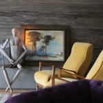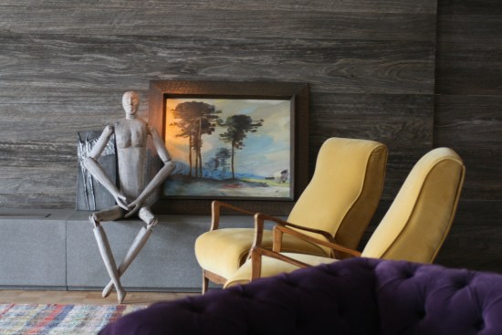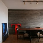 Two walls were coated gray wood and a block 5 meters basalt fits Ethanol fireplace.