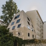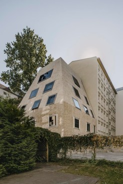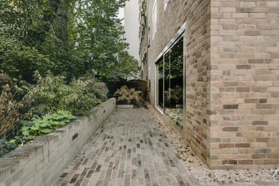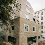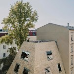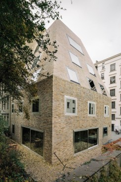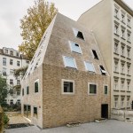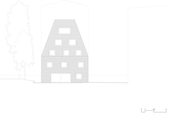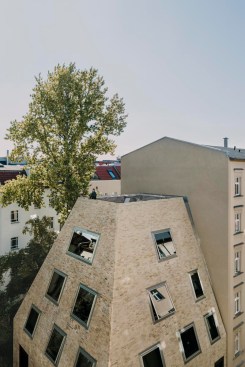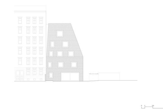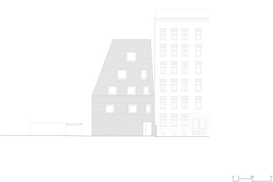 Tucked away in the inner courtyard of a block in Berlin’s Prenzlauer Berg neighborhood, an unusual residential house has emerged: With it’s steep roof looming some 10 meters above the building — more pyramid than cube — this boldly shaped building is entirely enveloped by a multi-colored brick skin. Irregularly proportioned aluminum-frame windows reference the history of these inner courtyards, often given over to industrial use in this area of the city at the time of the district’s initial development. At first glance, the appearance of the house does not seem to adhere to popular current conceptions of context-driven building expansions. In fact, it is the end result of tight parameters stemming from building regulations and historic preservation conditions. Used creatively as design tools, these restrictions led to a building that seems at the same time both familiar and strange, capable of blending into its surroundings while maintaining a strong independent character.