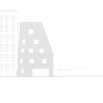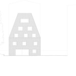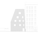 Within a framework of redensification, two initially conflicting positions needed mediating: the historic preservation office, involved due to the existing heritage protection of the building block ensemble, stipulated that the new building follow the cubature of the initial structure that had been destroyed during the war, in effect reconstructing the original configuration. But this was rejected by the city’s building department due to current setback regulations. The solution was to create a steeply sloped roof with an eave height of only around 7.50 m. With a slope of just under 70°, the roof stretches over three stories up to the building’s upper edge, standing at a height of approx. 18 m, where a roof terrace seems to clip the pyramid’s peak. The resulting volume, resembling the archetypal shape of a house in a child’s drawing, satisfied the prescribed distance requirements between the building and the three neighboring plots. Just like its predecessor, the almost square-shaped structure stands with its back flush to the firewall of the rear building of the abutting courtyard. A shadow gap, widening significantly from the eaves upwards, underlines the independent nature of the new building.