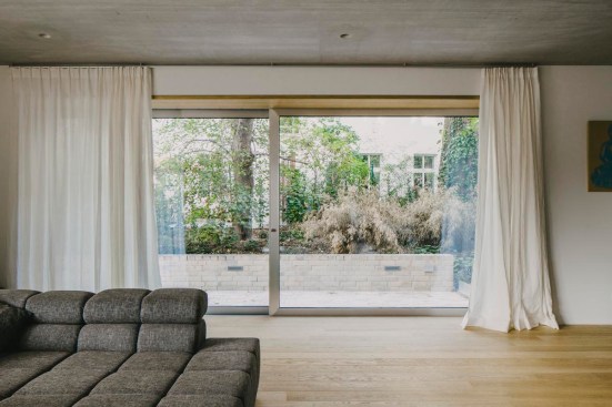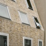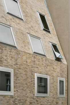 Along with the lively fabric of the brick façade, irregularly applied windows help to loosen up the strict geometry of this building that asserts itself as an unmistakably contemporary complement to the ensemble. Where the new construction meets the adjacent buildings, the windows orient themselves according to the sizes and proportions of those of its neighbors, eventually shifting with growing distance into square and horizontal formats. On the third floor, their bottom edge precisely matches the eave height and corresponds with the height of the windowsill. Their wide frames, made of polished anodized aluminum, are recessed flush into the building. Their metallic shimmer, smooth surface and sharp edges providing a perplexing moment in the otherwise traditionally crafted brick façade, replete with intentional irregularities.