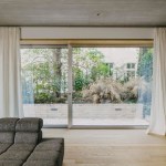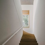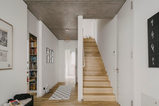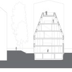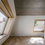 The house has two residential units that are organized as multi-level apartments. The lower unit, about 250 sqm, is organized into a ground-level living floor opening onto a private courtyard garden, with bedrooms located on the second floor. The upper apartment, about 200 sqm, consists of four levels: two for living, one for sleeping, and a roof terrace. The common staircase, the internal stairs of the living spaces, and the auxiliary spaces and utility rooms on all floors are compactly condensed towards the firewall.