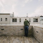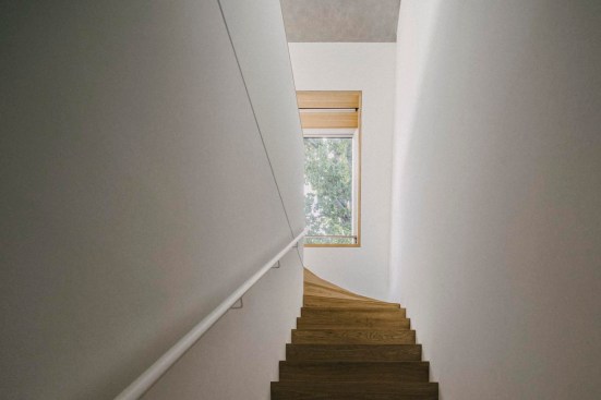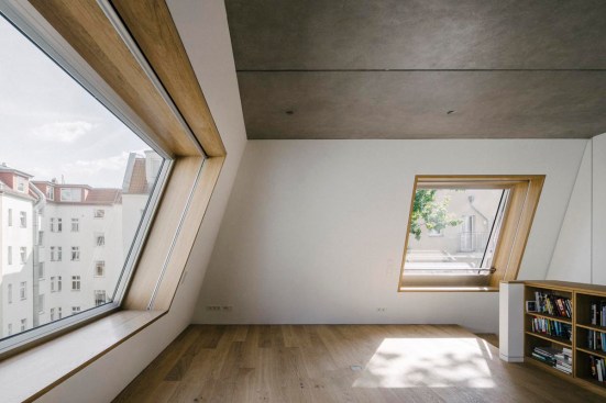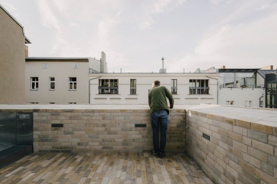 A brick skin seamlessly covers the cubed volume produced via these limitations — from the vertical exterior walls, over the sloped façade and attic, up to the floor of the roof terrace. The bricks form the outer layer of a double-shelled construction. The exterior shell’s brickwork references Gründerzeit construction methods and the materiality of the front building’s street-side façade, while its color spectrum quotes the tones of the surrounding façades within the courtyard. For this, a Brandenburg brick manufacturer fabricated 20,000 bricks in a range of six different colors: from off-white and yellow to orange-brown, pink, and grey. The bricks bear idiosyncrasies: either deliberately worked on before firing or with incidental traces of production and storage left visible, they cover the walls in an uneven pattern. Executing this unusual treatment on the sloped façades demanded a high degree of precision, applying the bricks via special supports and creating individually molded corner stones for the edges. Finally, the entire surface of the brickwork has been finished with a wash.