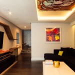 Art as an object in the form of modern paintings, complements several spaces of this apartment, visual finishes are emphasized not only on walls, the TV room ceiling, for example, surprises the user by including a large format piece.