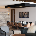 The central landmark of the public area is the library, which is accentuated by a completely sober fireplace finished in grey marble. By its location and transparency, this area can be seen throughout the apartment.