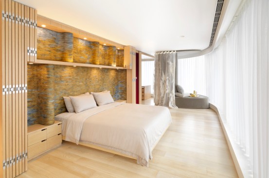 The name of the project was adapted from that of a famous Beijing garden. The idea of “perfect brightness” was explored architecturally: beginning with research into the psychological effects of different qualities and colors of daylight, a system was developed whereby ambient lighting could change from warm to cool white, depending on the season, time of day, and outdoor lighting conditions. The light is “concentrated” at the center of three twisting, shell-shaped feature walls, drawing visitors in from the entry, providing a special dramatic accent in the daughter’s bedroom, and culminating in a unique and dramatic spa bathroom.