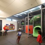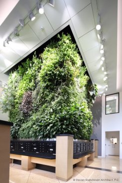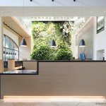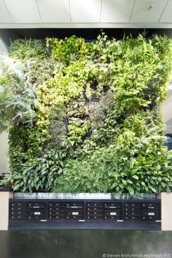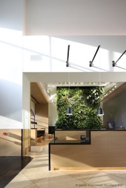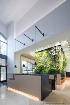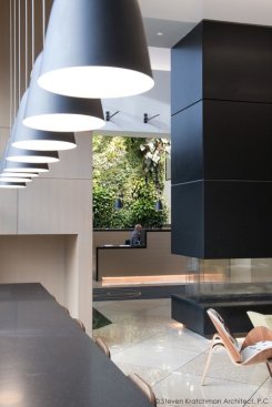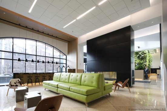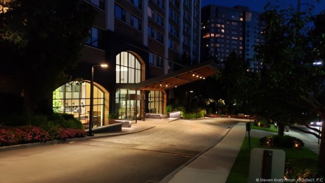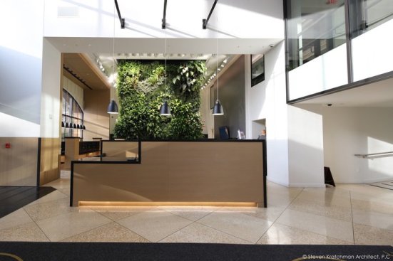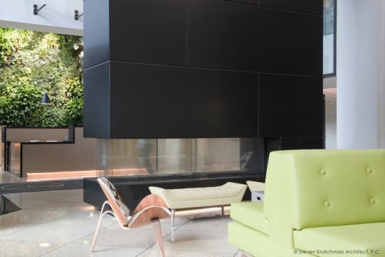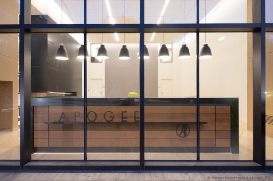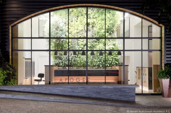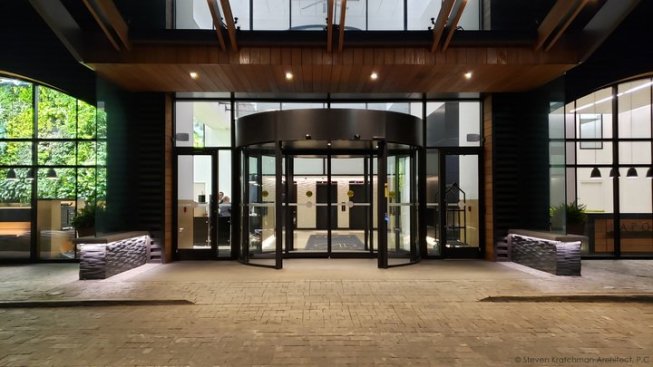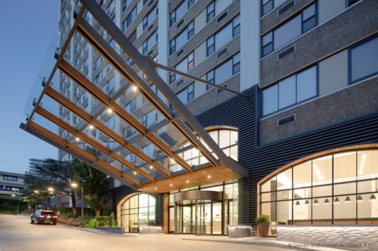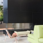A four-year, multi-faceted renovation of Apogee in Cliffside Park transformed the 30-story cooperative along New Jersey’s Gold Coast into an ultra-modern high-rise with sophisticated elegance. SKAPC served as master planner, architect and designer of the project, focusing on exterior curb appeal and interior amenity spaces to enhance the resident experience and increase shareholder value. The original property included what appeared to be an abandoned lobby and foreboding concrete canopy. Employing an inclusive process with Board constituents, management and shareholders, the SKAPC team considered inventive ways to refresh existing elements to minimize cost and maximize sustainability. SKAPC’s design created an eye-catching entranceway and inviting interior of the three-story lobby, which serves as the project’s centerpiece. Wide-ranging improvements included replacing the existing canopy with a distinctive glass, metal and wood marquis; relocating the redesigned front desk; introducing a large, two-sided fireplace in the lobby as a divider; creating a four-sided, double-height living wall – one of the lobby’s most dramatic elements – that has a sculptural feel with each side changing to reflect the exposure and light conditions.