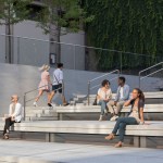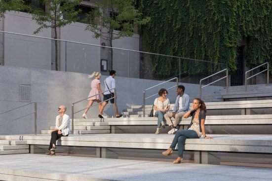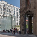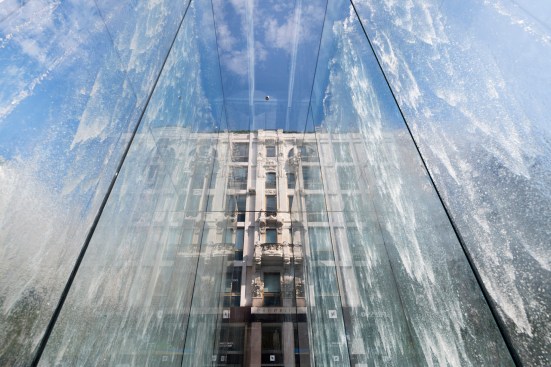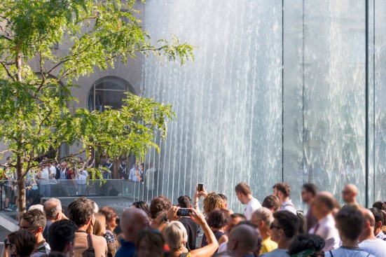 The fountain flows down into the base of the Amphitheatre, a new social hub and an outdoor extension of ‘Today at Apple’. The Amphitheater is defined by broad and sun-soaked stone steps descending below street level and opening up to a stage, backed by a second fountain’s wall of water. The entire plaza is newly created and paved with Beola Grigia – a typical local stone from Lombardy, and surrounded by 21 new Gleditsia Sunburst trees.