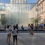 A celebration of the joys of city life and embodying its dynamic nature, the signature water feature is an interactive, multisensory experience. Visitors enter the fountain through a glass-covered entrance enveloped by the sights and sounds of vertical jets of water that splash against the 26-foot high glass walls. An immersive recreation of the childhood game of running through fountains, the experience changes throughout the day as sunlight filters through the water, while at night the glass ceiling creates a kaleidoscopic effect, with the water falling down the walls, and its reflections travelling infinitely up the sky.