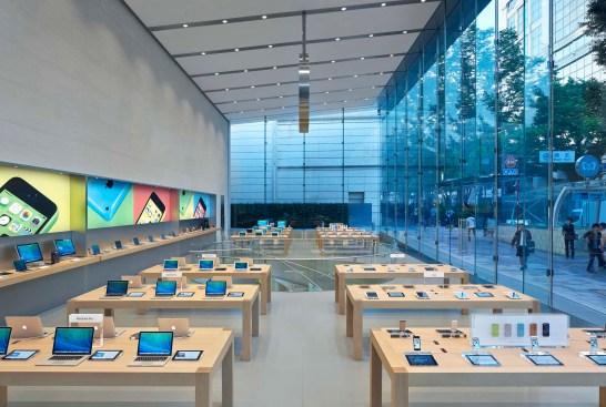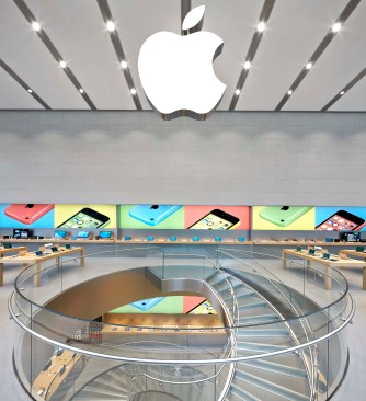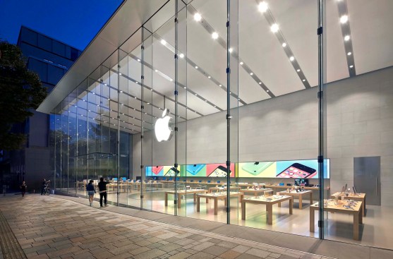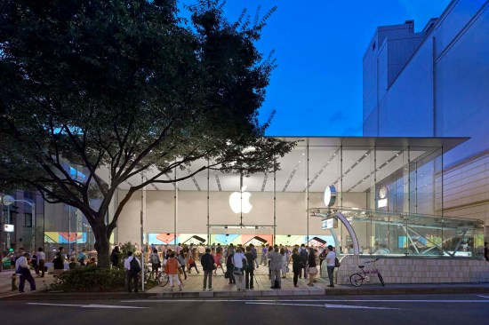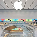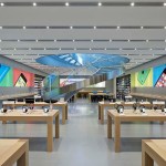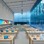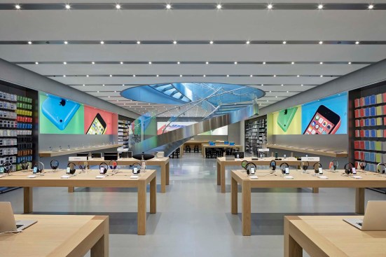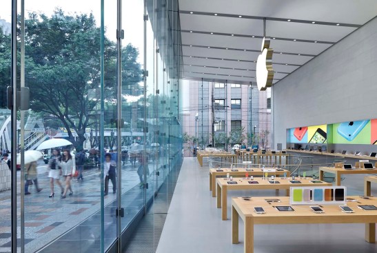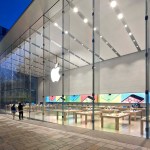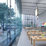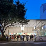 Unique to the Omotesando store, the stainless steel and glass spiral staircase represents a new advancement in Apple and the design team’s pursuit of innovation. Precisely fabricated arcing stringers span seamlessly more than 16 vertical feet between levels, landing delicately at the basement floor with a subtle shadow gap. Glass steps resting upon radial stainless steel risers are illuminated by daylight from the ground level, creating a soft glow on the floor below. Every detail in the stair has been scrutinized to achieve a refined, minimal appearance, belying the technical rigor of the assembly. In this reductionist stair design, the sweeping surfaces of the stainless steel structure take center stage, animated by brilliant reflections in the finely brushed finish.