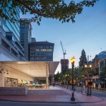 This store faced a unique challenge in that it was built above an active group of shops in the underground mall of the Pioneer Place Tower, with which it shares support space. In order to contribute to the urban streetscape while being slightly elevated from it, a series of shallow steps and a small exterior plaza with seating gently rise from street level to the store entry, providing natural gathering and resting spaces for both customers and passersby.