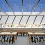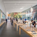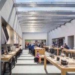 As expected, the Apple product is featured at the beginning of the customer experience, but at Stanford a broad, glass-enclosed room makes the retail environment feel a part of the outdoor plaza, and the outdoor plaza part of retail environment. With 180 lineal feet of storefront glass and three entrances, rarely has an Apple Store been so visually recognizable and physically accessible. It is a store design that directly invites you in to experience the product and the space underneath a dramatically thin roof. Structural glass fins along the perimeter of the transparent room support the thin roof, leaving the space column-free and enhancing the sensation of a floating ceiling.
