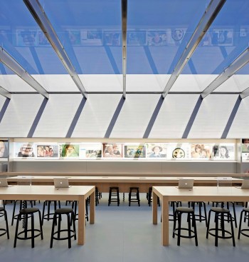 This two-room, pavilion-like store was designed for a unique location within Palo Alto’s Stanford Shopping Center. It is a fresh and evolutionary direction for the Apple retail program with a design that is a re-interpretation of the favorite architectural themes developed over the past 13 years, while retaining many of the familiar elements associated with Apple Stores.