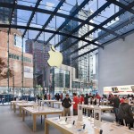 Daylight fills a circular opening where a spiral glass stair descends to a lower level dedicated to product service, learning areas and accessory displays. Bead-blasted stainless-steel wall panels reflect borrowed light and provide a luminous backdrop to the stair.