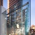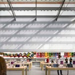 The store lies between New York’s residential Upper West Side and the vibrant performance venues of Lincoln Center. Its inviting, day-lit interior is visible to the bustling city through the taut 40-foot-high glass façade marking the street corner. The angled façade meets a gently arcing glass roof, supported by delicate steel trusses spanning 60 feet between massive stone walls. The ground floor is organized by the spatial rhythm of the trusses and uniform grid of display tables. It is open to the changing sky, allowing light and shadow to animate the calm gray stone.