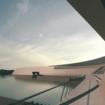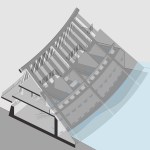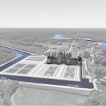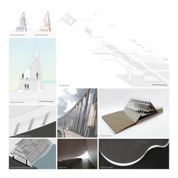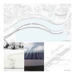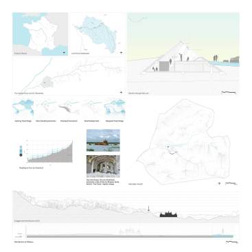 Château de Chambord is drowning: a victim to the forces of climate change. Our proposal takes flooding to an extreme–one in which cultural heritage is at risk of being lost. Regional analysis and sections of the site’s topography reveal a point of intervention for holding and diverting water away from the marshy land at the base of the Château. Our project, a low-dam that diverts water downstream of the Château, is built to resist the rising water. A large ribbon is defined by two twisting surfaces that slip above and below one another, taking advantage of the prevalent wind and sun while a public path weaves between the surfaces. From the Château, a thin line cuts across the horizon; reflective glass abstracting the domain beyond.