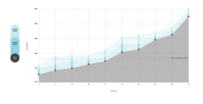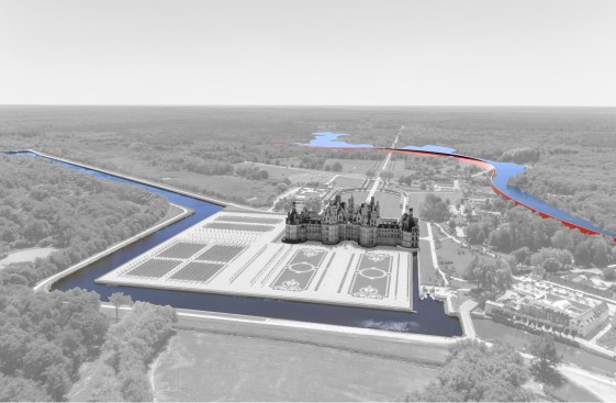 The project is located in Chambord, an UNESCO World Heritage Site in the Loire Valley of Central France. The Château was constructed in 1519 and sits in a 13,000-acre protected site, entirely enclosed by a wall for much of the last 500 years. This region is a Subpolar Oceanic Climate, with average temperature ranges of 3.2°C (37°F) in January to 19°C (66°F) in July. Yearly rainfall comes to 25-­30” overall, often focused in intense storms late in Autumn. The Cosson River bisects the domain North/South and has been modified to align with the Château (construction of the castle required that its marshy site be drained). This poses a risk to the castle during the rainy season. In 2016, the site experienced an unprecedented flood that threatened the castle. Much of the site is heavily forested and interspersed with ponds, lakes and tributaries. Winds come from the South-Southwest much of the year
