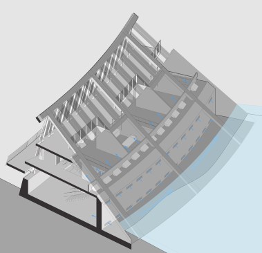 The focus of our project is a strategy for water retention, protecting Château de Chambord from flooding while maintaining the existing ecosystem. Across the nearly 3 kilometers of the project a variety of conditions exist. Nearly 1.8 km of the project on the West side is a simple concrete retaining wall. To the East, the wall thickens to create an occupiable section. While the two surfaces define an enclosure nearly 19,000 m2, only 12,500 m2(135,000 ft2) is fully enclosed. The program of the building has a purposeful dual nature: a social rehabilitation facility matched with an ecology research. Residents work alongside researchers to conduct ecological research with direct access for field experiments. Sensitive laboratory programs are woven with medical and therapeutic facilities; residential room and amenities, dining and relaxation areas; storage and administrative zones. Access to both the lake and the forest is crucial for both healing and research.