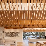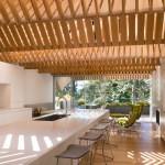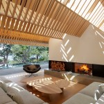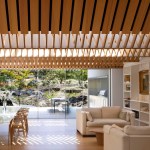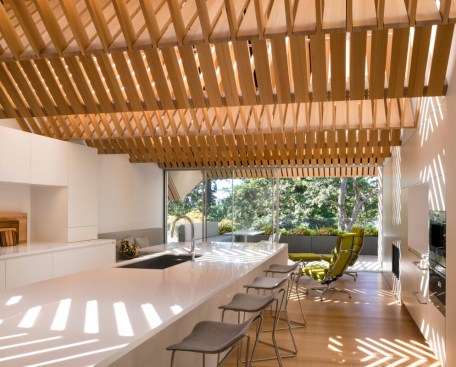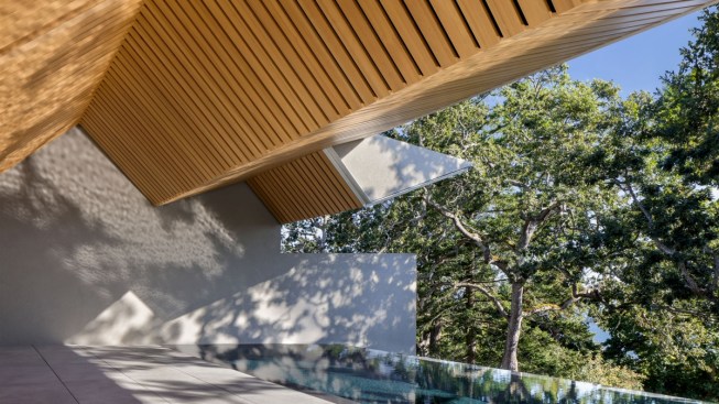 While views of the verdant landscape and water from up here are stunning, the interior also presents a feast for the eyes: The architecture quite literally weaves the site’s surroundings and sub-Mediterranean climate into the interior through an intricate wooden arbor ceiling. The sawtooth-like composition of Western hemlock slats is suspended below a series of operable skylights, producing a dramatic light show as the sun progresses throughout the day.