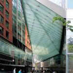Opened to the public this spring, the canopy comprises three tilted glass triangles wedged between Goldman’s 200 West Street building and the Conrad Hotel. Made from 948 laminated-glass lites from supplier J.E. Berkowitz, the double-glazed triangular forms have an upper and lower plane of glass serving as the arcade’s roof and ceiling, respectively. The glass surfaces sandwich the canopy’s structural and cross-bracing members.