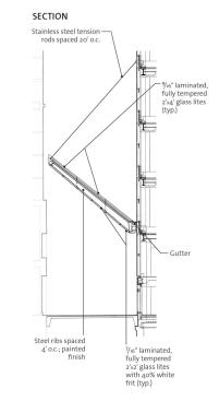 Sizing and installing the metal structural members were the project’s greatest technical challenges, says PCFP partner Michael Flynn, FAIA. Spaced 4 feet on center and varying in length from 19 to 35 feet, the 86 wide-flange members were all custom-made by American Architectural Inc. “The care and precision with which they were made and placed determine the sheerness of the top and bottom surfaces of the glass,” Flynn says.