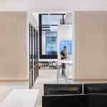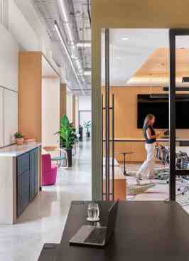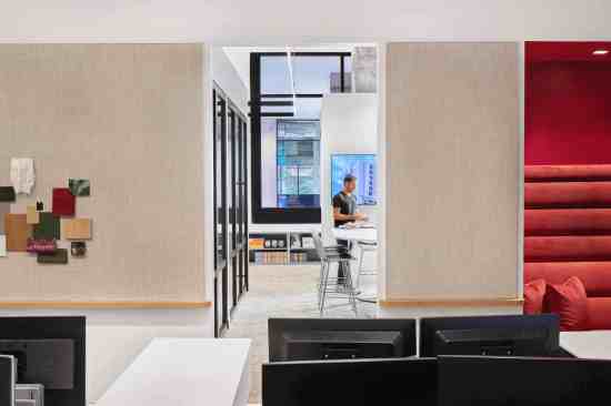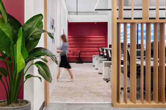 The team that now occupies this office are also the architects behind the visually stunning, technologically innovative, and eco-friendly workspace. Drawing inspiration from nature, the city, and their extensive knowledge of hospitality design, they created an ambiance that exudes complexity, style, and comfort. Upon entering the 7,500-square-foot office, visitors are greeted by a spacious reception area that radiates luxury and warmth. A stunning 15-foot tall and 42-foot-wide warm wood screen is the focal point, inviting natural light to enhance the space’s beauty. A custom fabric light fixture adds to the ambiance, while lush green tropical foliage infuses a sense of warmth and welcome.