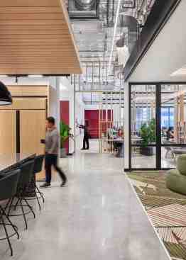 The office’s design promotes collaboration, transparency, and well-being. With open ceilings and large windows allowing natural light to flood the space, productivity, and energy levels are uplifted. The free layout artfully highlights the building’s architecture, fostering teamwork and efficiency. The conference rooms feature advanced technology and sleek glass walls, offering privacy and functionality. A welcoming pantry space with an oversized island and rejuvenated dome light fixtures encourages socialization and relationship-building. Every element of the office space was thoughtfully considered, from the vibrant color scheme to the custom carpet pattern that adds a burst of color and playfulness. The result is a functional and flexible workspace that encourages productivity, connectivity, and well-being.
