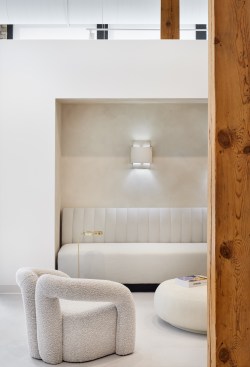 The space embraced the historic building and the curves of the materials and forms in the space contrast the brick and old warehouse character of the space. The two-story salon features areas for styling and spa services
