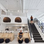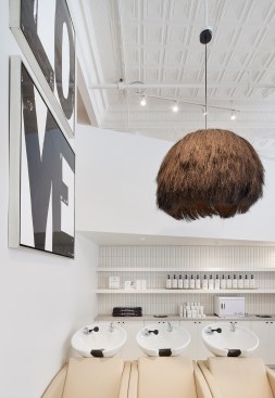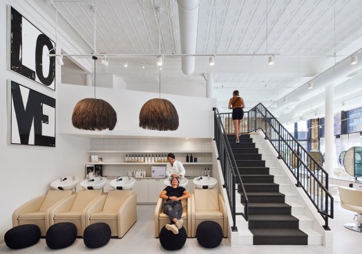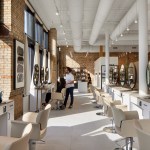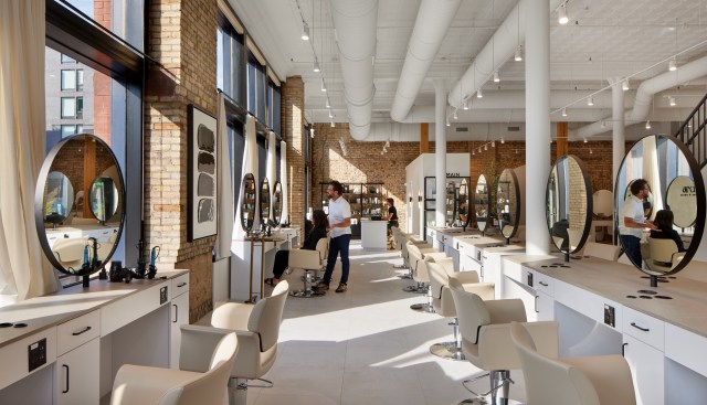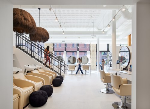 The styling floor features floor to ceiling windows and create a stage like performance for the stylists to show the neighborhood their skills as they work.