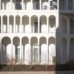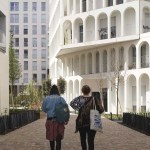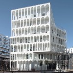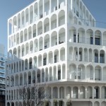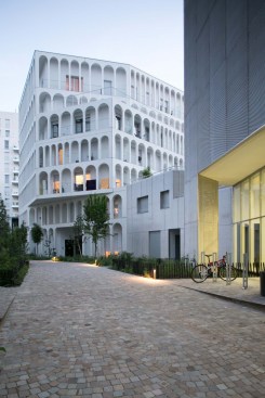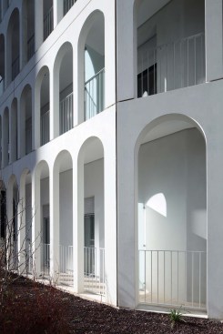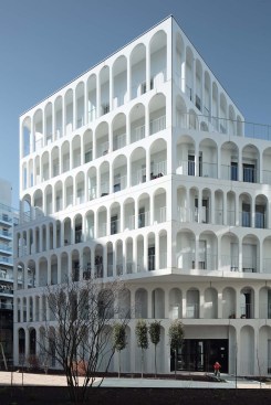 Visible from all sides, like a sculpture set on the ground, the building evolves evenly across each facade. The arch compositions are a contemporary interpretation of the classical vocabulary of the former Renault factories, yet this second skin is not just a formal one; the arches, in fact, extend around the building fulfilling different functions, with the accent on accommodation.