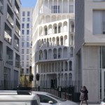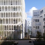 White concrete, implemented in several ways, is the material connection between the buildings in the project. They are also connected through a common garden, located in the centre of the Macrolot B5. Not only is this generous garden visible from the surrounding streets through vaults in the buildings, but it also forms a generous ecological biotope providing calm and green views to the inhabitants. Additionally, most of the rain water is immediately treated on site to prevent over pouring the urban drain system. As a result of this, the Macrolot B5 works as an ecological hamlet, inviting people to meet, talk and reinforce a more environmental behaviour.
