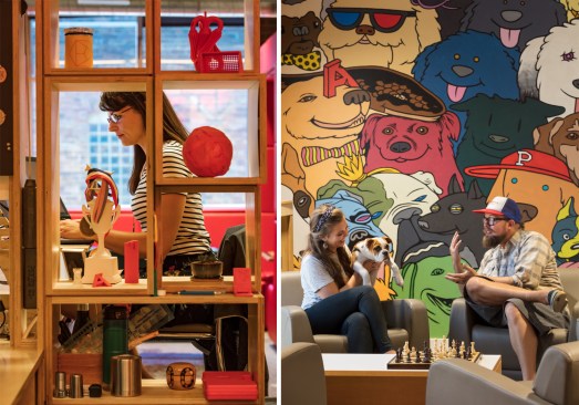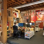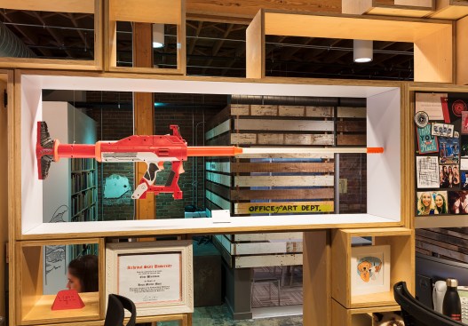 The winning solution, dubbed the Wunderkammer, references the centuries-old “Cabinet of Curiosities.” The youthful and creative nature of Archrival’s studio has led to the accumulation of a number of personal artifacts–trophies, artwork, nerf guns, luchador masks, a sombrero, etc.–which represent their individuality and collective culture. Rather than leave these items unorganized throughout the space, they become the driving force behind the space itself. Displayed in multi-compartmented cabinets and vitrines, arranged to inspire wonder and stimulate creative thought, the wunderkammer celebrates Archrival’s unique culture by curating the studio with their own personal objects. Workstations organically emerge from the wood box grids. Red vinyl-wrapped jam spaces locate themselves around the perimeter, facilitating chance encounters and creating a dense overlaying of people, allowing creative energy to permeate the studio. Curating opportunities for open, semi-open and enclosed work spaces, the design accommodates a myriad of different working styles and personalities.