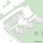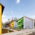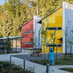 To one of the pressing questions confronting residential architects today—How do you make affordable housing that doesn’t look like affordable housing?—Portland-based Holst Architecture has responded with a project that transforms economical materials and ease of construction into opportunities for aesthetic exploration. Argyle Gardens, located in the city’s Kenton neighborhood, is sited on a curious loop of public land that is wedged tightly between low-rise office buildings and commercial warehouses. The project consists of four simple brightly colored and gabled volumes that look enchantingly cartoonlike. On closer inspection, the broad face of each “house” is revealed to be its short end, a pseudo-façade split down the middle with one side recessed and clad in composite panels, and the other side protruding and featuring plastic glazing. The primary entrances are tucked into the cleft between the two sides of each façade, effectively hiding them from the street.