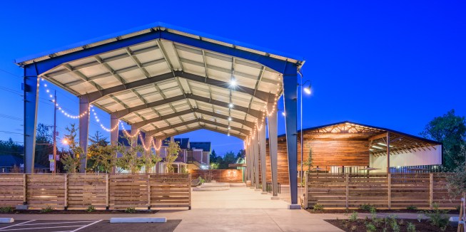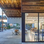 During construction, 100 percent of the concrete and steel was recycled or repurposed with some elements, such as siding, roofing, and fixtures, finding new life as primary design features. As materials were deconstructed, they were catalogued and assessed for potential reuse. Throughout the site, remnant foundations were preserved as evidence of the complex’s past. The result is that materials are celebrated in their natural state, in some cases even when less than perfect. In one instance, the wood beams of one building had warped and twisted as a result of not having a strong base to sit on. Rather than hide these structural flaws, the design allows these beams to protrude from the wall and display their spiraling shapes—an homage to the building’s history and a subtle nod to the nature of nature.