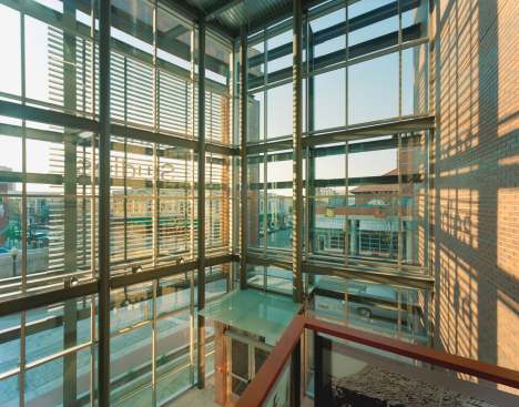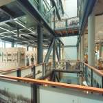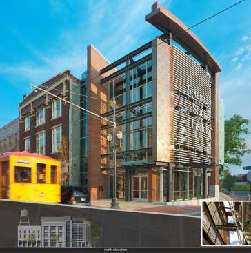 Archive receiving and documentation occurs in the historic 1914 Geyer and Adams building, while the heavy archival shelving occupies four full floors of the 24,000 sf new addition. A thin atrium stretches the building’s length between new and old, flooding all levels with light – a key sustainable strategy. 100 historic images in glass handrails signify that architecture can and should actively engage in storytelling. Public Spaces – galleries, a café, a museum, and meeting rooms – enliven streetscape storefronts, while the great research hall encompasses the entire second floor of the 1914 building. Suspended bridges span the gap between new and old, open and secure, today and yesterday. The west façade’s frosted glass fins control sun exposure while displaying historic faces of Arkansas life, like large bookmarks in time.