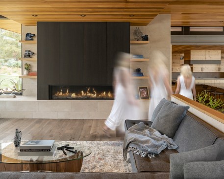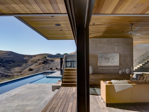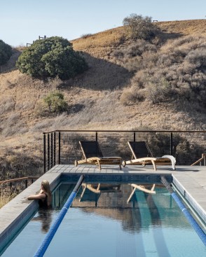 The pool terrace and adjacent open-air living room unfold onto the meadow and ultimately the arroyo below, augmenting a natural, preexisting path for animals with a minimally delineated walking loop with which to explore the site. The sensitive nature of the fire-susceptible landscape, as well as the unique climate, solar, and seasonal conditions, called for careful positioning of the home, as well as consideration of plant specifications and irrigation requirements.