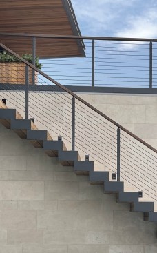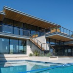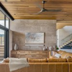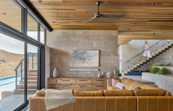The lower level, containing a home gym, laundry room, guest suite, and pool terrace, extends into the hillside, providing an unobstructed panoramic vista. The continuous materiality of cedar and limestone accentuates the experiential relationship between inside and out. This connection to the outdoors continues on the upper level, which contains the primary bedroom, home office, two secondary bedrooms, linear balcony, and lounge deck.