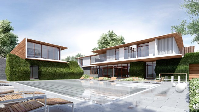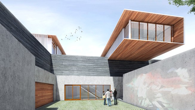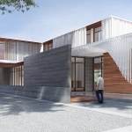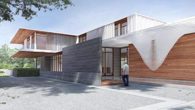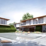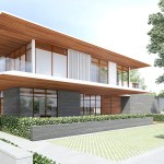 The main level is clad in limestone and contains the living spaces-the living room, kitchen, dining room, and his and her offices. Five upper level bedrooms – for the couple, their two children, and two lucky guests – cantilever dramatically. They take the form of cedar-wrapped boxes with expansive wood windows screened by aluminum louvers. The deep overhangs taper down to a thin knife edge.