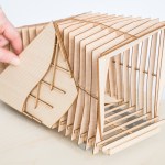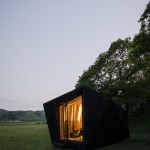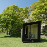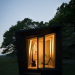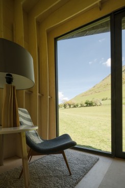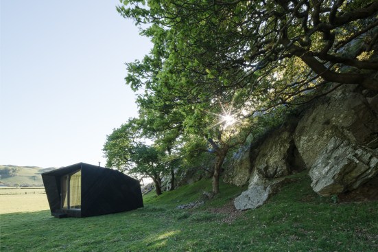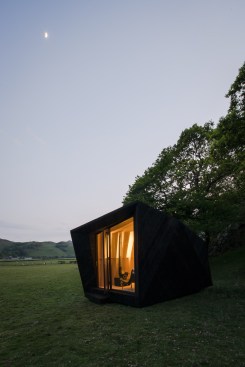 The design takes its inspiration from the ancient landscape of Wales but utilises modern construction techniques. The structure is a combination of CNC-cut birch plywood ribs and sheathing panels, which act together to form a composite structure. The structural ribs are comprised of either three or five individual sections of plywood, tightly fitted together using ‘jigsaw’ joints with a high degree of tolerance. As a single internal material, the plywood provides both structure, finish, fixtures and fittings – including a plywood sink and bath. The faceted envelope is clad in locally- sourced Welsh larch boards stained black, with sheep’s wool insulation part-filling the cavity.