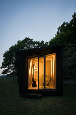 The cabin is heated via a small log burner, has hot and cold water, LED lighting powered via photovoltaics and a self composting WC.
