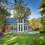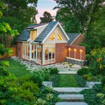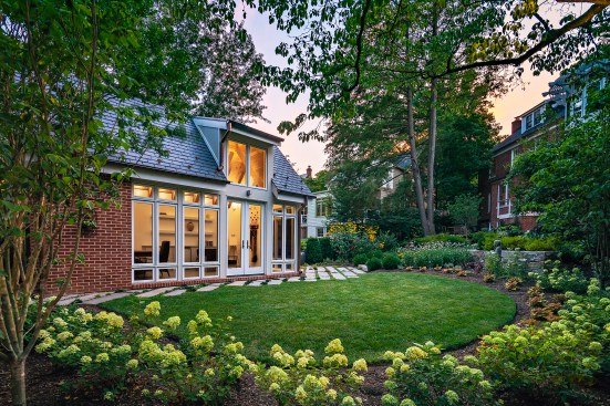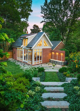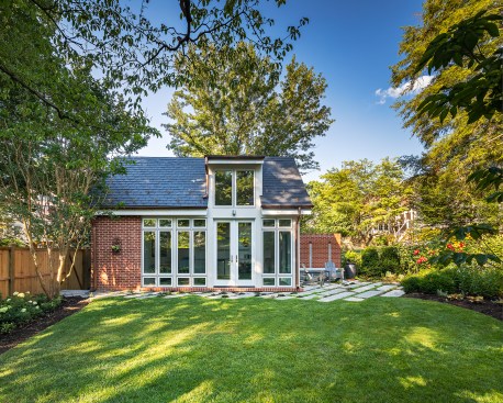 Conceived as a retreat and sanctuary space this small accessory structure is carefully sited in the rear garden of a large wooded lot in Northwest DC. The building, not only creates visual interest in the garden, it serves as the focal point for family gatherings and outdoor activities. The space is fully conditioned which allows for use throughout the year. The owners inhabit the space daily as painting studio, yoga room, and an escape from the noise of the city. The windows, brick, slate, and copper echo the material palate of the existing house. This allows the studio to remain deferential to the larger main structure while creating a lantern that draws the visitors out into the garden. Exposed Douglas Fir ceiling beams and roof decking give the small structure a sense of grandeur and warmth that belies its tiny footprint. The landscape, a carefully composed experience of framed views and unique spaces, evokes a calming, Buddhist-like setting. The studio is not only a place for quiet contemplation and mindfulness, it also allows for future expansion with a simple conversion to an accessory dwelling unit.
