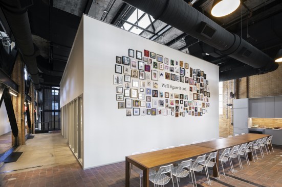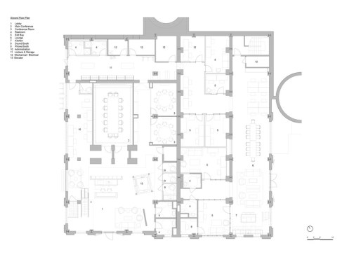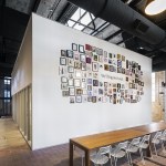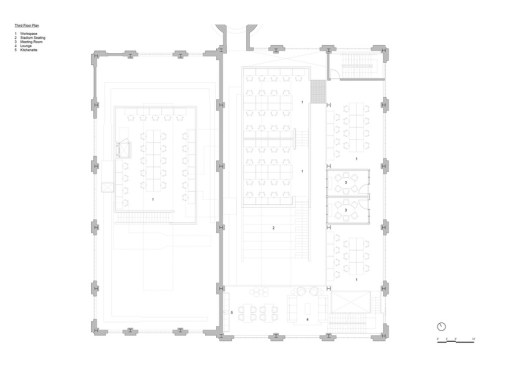 The building envelope, featuring expansive steel windows and skylights, allows for ample natural light. The new white program and functional elements establish a dialogue with the aged and layered character of the existing structure. The upper sections of the two main program blocks house open office areas and a spacious internal amphitheater space, while the lower sections offer quieter meeting and team space required by a 160-person team. The basement level is designated for darkrooms, photo and digital production, and projection/screening rooms, making the most of the building’s natural light arrangement.