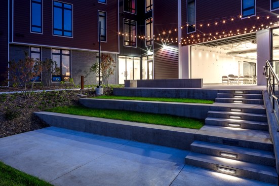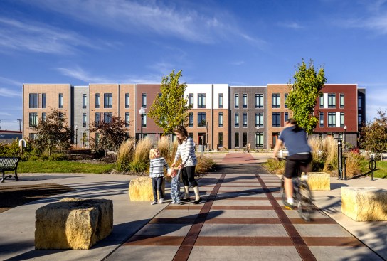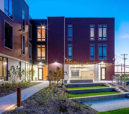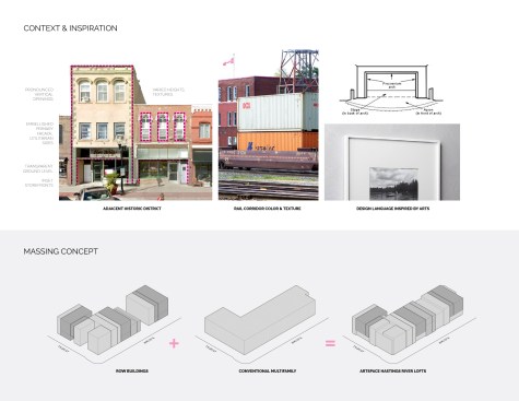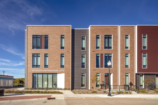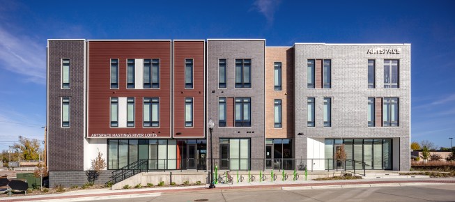 Developed on a former industrial site on downtown Hastings’ historic main street, Artspace Hastings River Lofts offers 37 live/work affordable housing units for artists and their families. The project also includes retail, art galleries, and flexible studio space that serves as an integral part of the growing artists’ community in the Hastings area. Situated between a commercial and residential district, the architecture acts as a bridge – connecting both the old with new and commerce with living. The design draws upon cues from its historic neighbors in a contemporary way – using familiar proportions, high quality materials, varying modules of height and depth, and simple but skilled detailing. Large windows and high ceilings offer abundant light in units and common areas, providing residents with affordable, high quality, flexible space.
