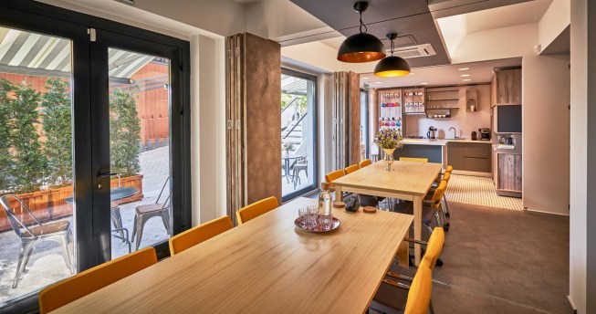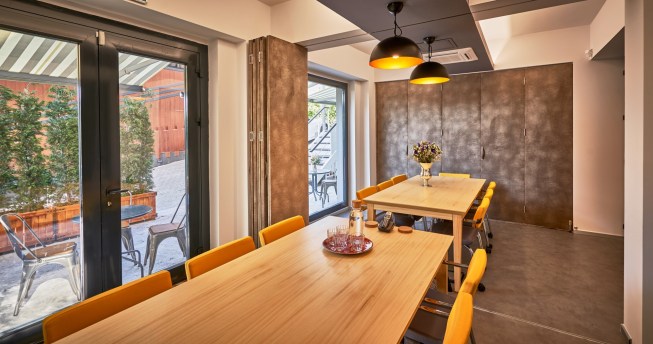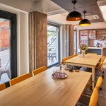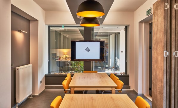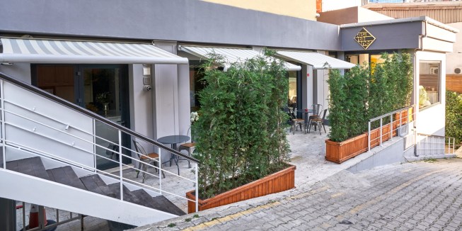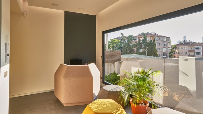 Mobile walls were designed in between the meeting rooms and also between the kitchen and the meeting rooms. These walls are designed to be moved and hidden in order to fit all the necessary functions otherwise all of which could not be fit in the limited space. Thus, when the walls separating the two meeting rooms were opened, it is possible to obtain a meeting room for 14 people with tables that joined together. When the wall of the second meeting room with the kitchen is opened, the entire area can serve as a cafe. All these mobile walls are designed and implemented to provide maximum sound insulation in all variable scenarios. The window frames on the cafeteria facade were turned into wide pivot glass doors to enable the use of the terrace area.