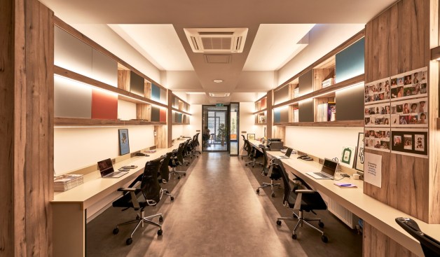 The reception area is positioned to define and separate the studio and office areas and entrances. In this way, office worker traffic and studio user traffic were separated.