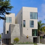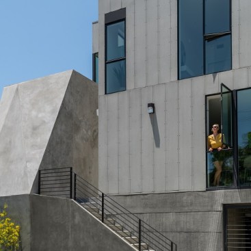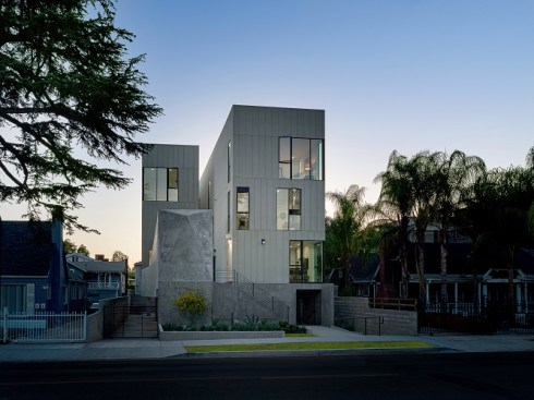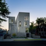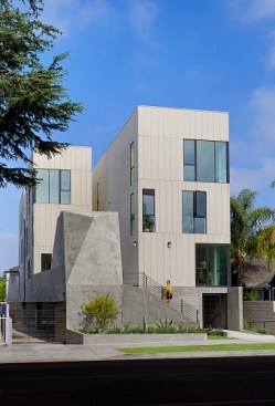 11,083 sq. ft., 5-unit multi-family residential project: This four-story project is conceived as a new approach to modern living in the urban center of Los Angeles. The parti diagram of the standard row house-style development is reconfigured to create more end/corner units: rather than five homes with the long sides touching, all the units are rotated ninety degrees so that four of the five units are corner units (rather than two). The resulting shallow footprints make it so that all five of the homes receive light for the full depth of their floor plan. Each three-level unit has 1,600 square feet of living space, large glass windows and a private roof deck with an outdoor kitchen.The building massing is designed to accentuate the verticality of the slender site. Additionally, the visual break between the parking level and the wood frame above is obscured—the board form concrete planter walls are folded up from the landscape to envelope the elevator core and obscure the lines between the podium and housing levels. The homes are clad with white cement board siding on the outward faces of the building, the materiality subtly shifting to white stucco within a series of internal circulation paths that are open to the sky above. These paths are again intended to express verticality, the corridors like slots in a canyon, creating a unique spatial experience. Drought tolerant landscaping is used throughout the site, as well as a rainwater capture-and-reuse system for irrigation. Designed as an alternative to suburban living, residents can reside in the urban center of Los Angeles and enjoy space, light, and indoor-outdoor living within a multi-family experience.