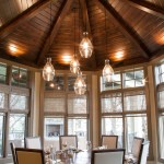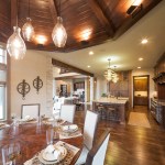 This spectacular entertaining inspired vaulted wooden ceiling octagonal dining room features a tongue and groove ceiling made from pine with a dark stain, 8 custom made uplights around the perimeter accentuating the octagon room and fine wood detail with a beautiful hickory wood floor with beveled edge grooves, 20 Marvin Integrity windows provide ample lighting for the area along with a custom chandelier featuring 5 individual pendant lights that provide illumination for this elegant space off of the back of the house to dine or entertain in. The dining space looks out onto the landscaping and covered lanai on the rear of the home creating an indoor/outdoor entertaining space.